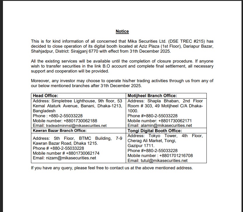 This is for kind information of all concerned that Mika Securities Ltd. (DSE TREC #215) has decided to close operation of its digital booth located at Aziz Plaza (1st Floor), Dariapur Bazar, Shahjadpur, District: Sirajganj 6770 with effect from 31th December 2025.
