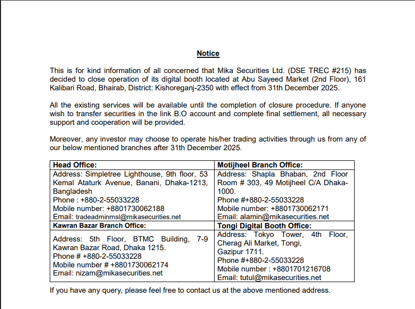This is for kind information of all concerned that Mika Securities Ltd. (DSE TREC #215) has decided to close operation of its digital booth located at Abu Sayeed Market (2nd Floor), 161 Kalibari Road, Bhairab, District: Kishoreganj-2350 with effect from 31th December 2025.